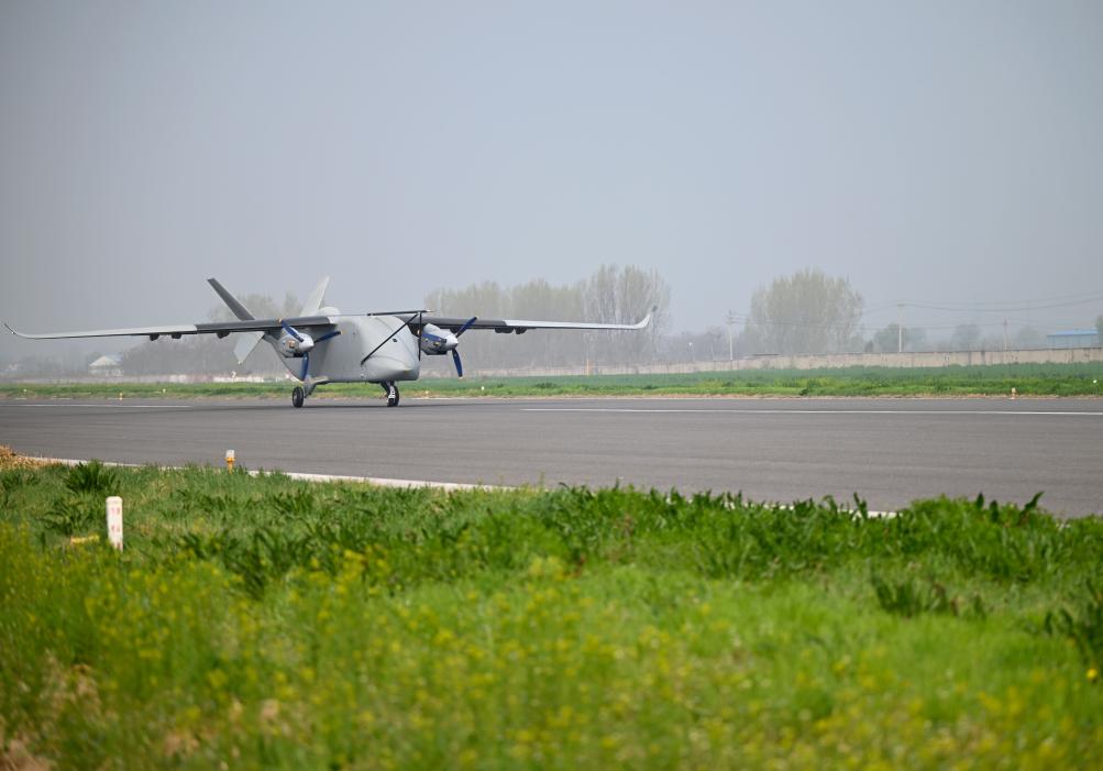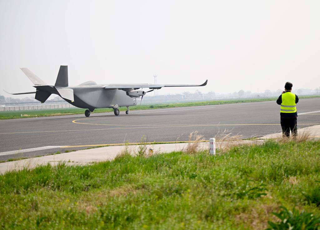 【新華社鄭州3月31日】中国河南省の鄭州上街空港で31日、7トン級固定翼無人輸送機「長鷹-8」が初飛行に成功した。