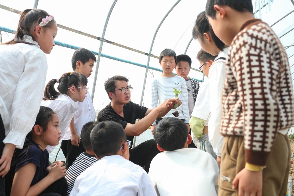 1日、子どもたちに栽培の知識を説明する江蘇農博園の職員。(句容=新華社配信/鐘学満)