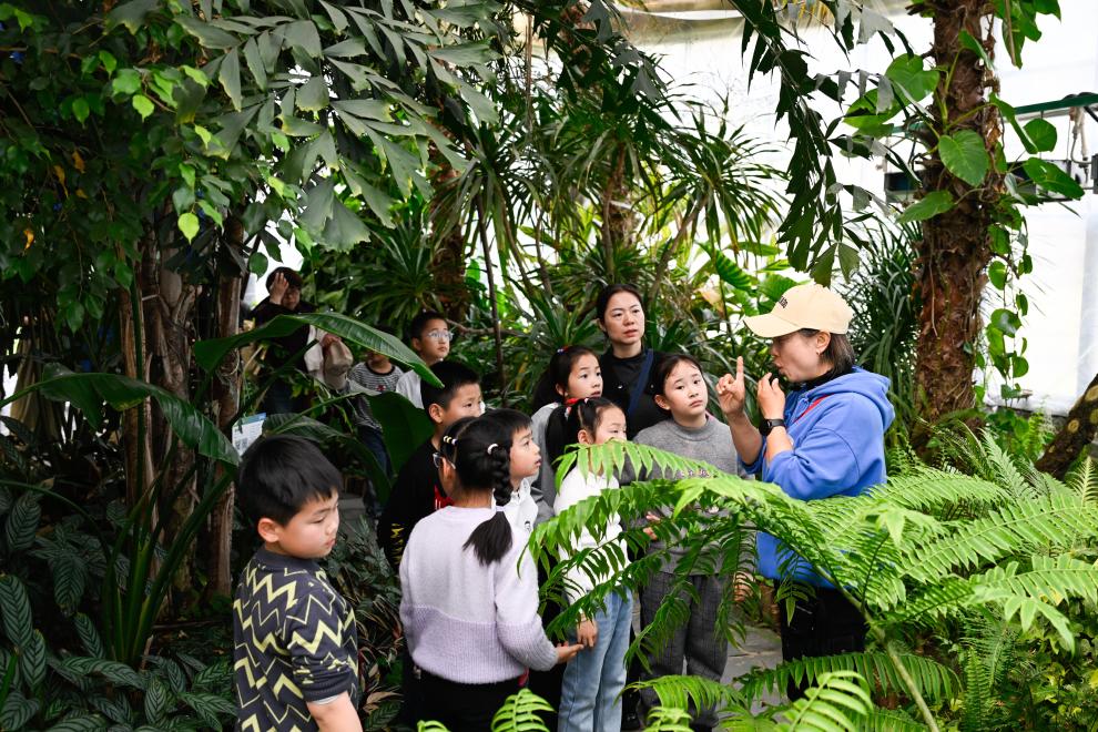 1日、子どもたちに植物に関する知識を説明する江蘇農博園の職員。(句容=新華社記者/季春鵬)
