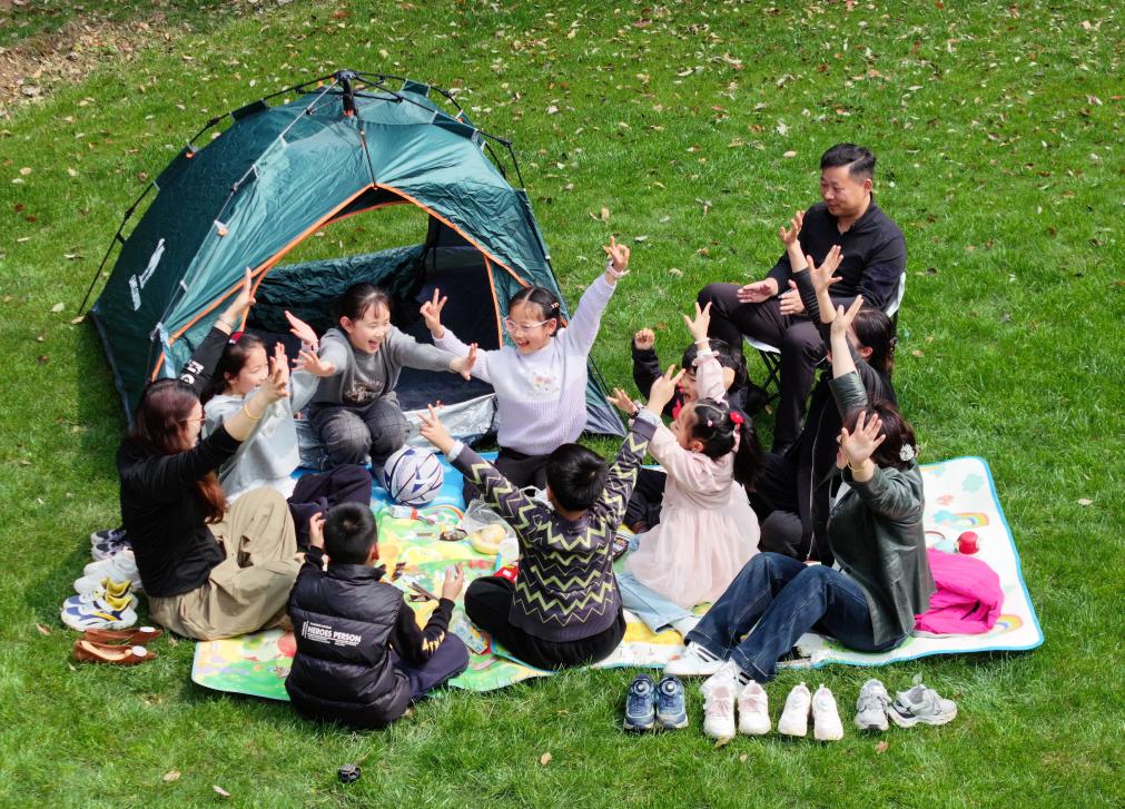 1日、江蘇農博園で家族とキャンプをする小学生。(句容=新華社記者/季春鵬)