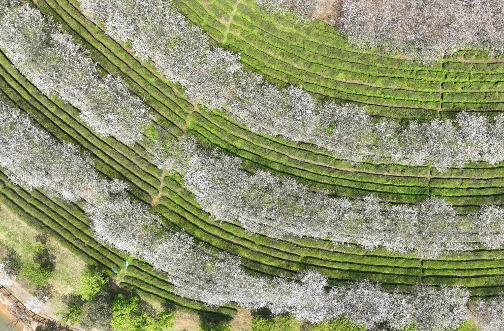 1日、満開の桜に彩られた鳳凰溝風景区。(ドローンから、南昌=新華社記者/万象)